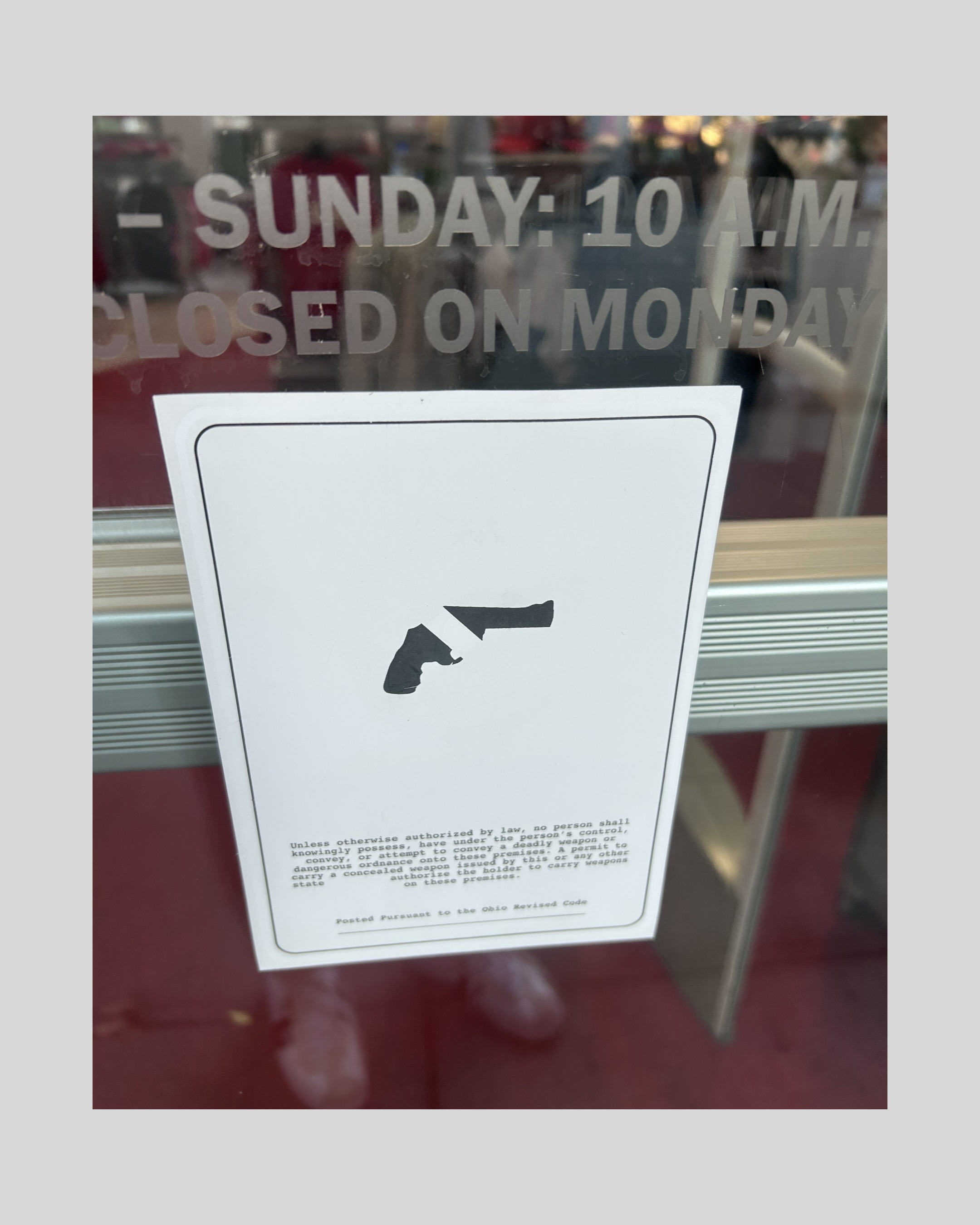 At the entrance: “No entry if you have any guns on you.” Gotta love America. Are they ever to sacrifice their access to firearms to reduce violence?